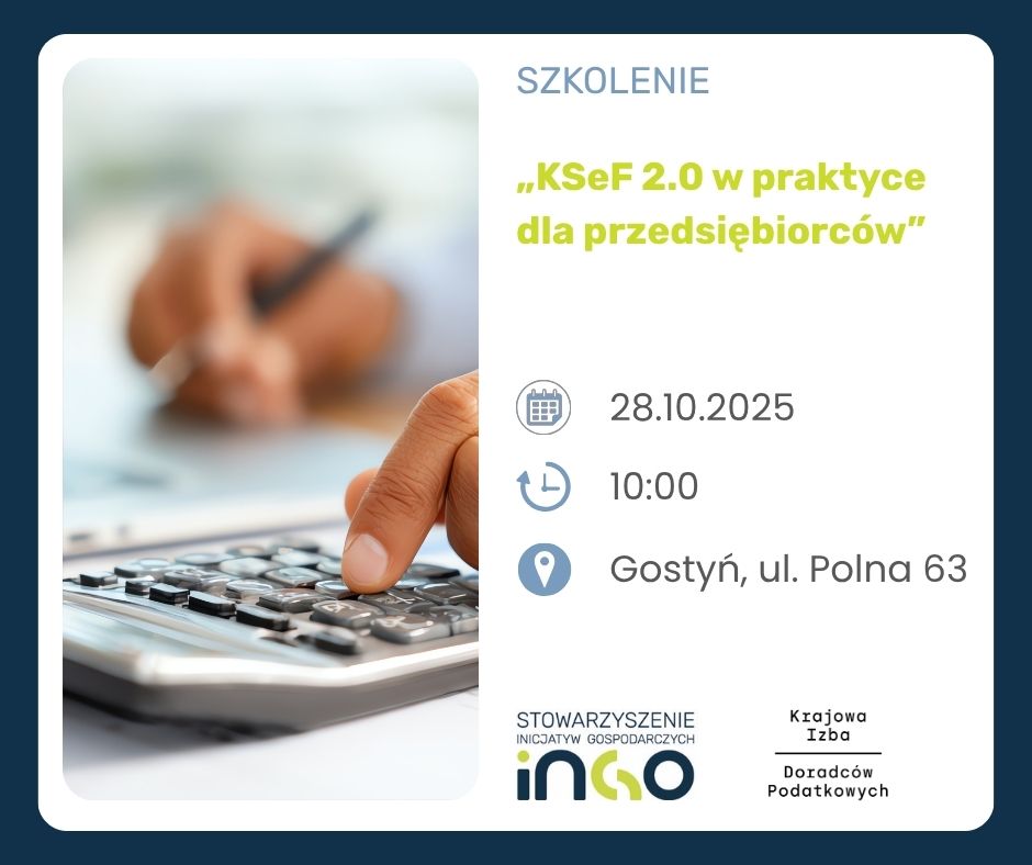 Stowarzyszenie Inicjatyw Gospodarczych inGO we współpracy z Wielkopolskim Oddziałem Krajowej Izby Doradców Podatkowych zaprasza na bezpłatne szkolenie stacjonarne „KSeF 2.0 w praktyce dla przedsiębiorców”.