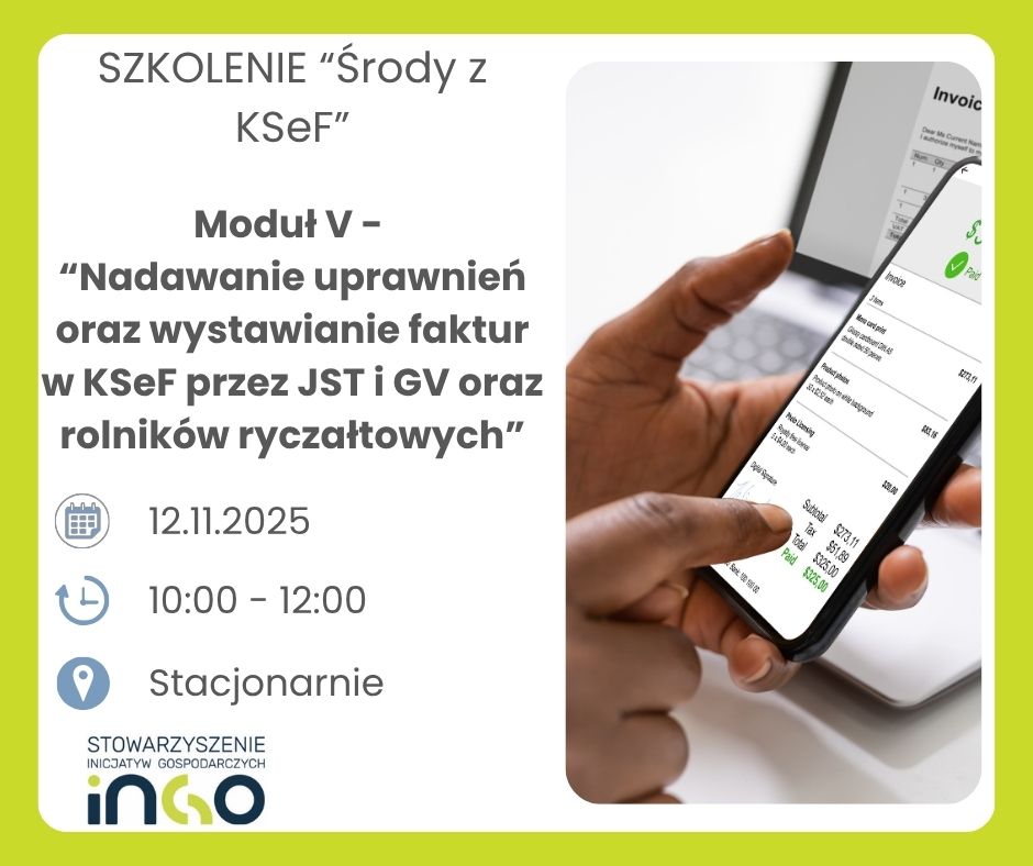 Temat najbliższego szkolenia: „Nadawanie uprawnień oraz wystawianie faktur w KSeF przez JST i GV oraz rolników ryczałtowych”.