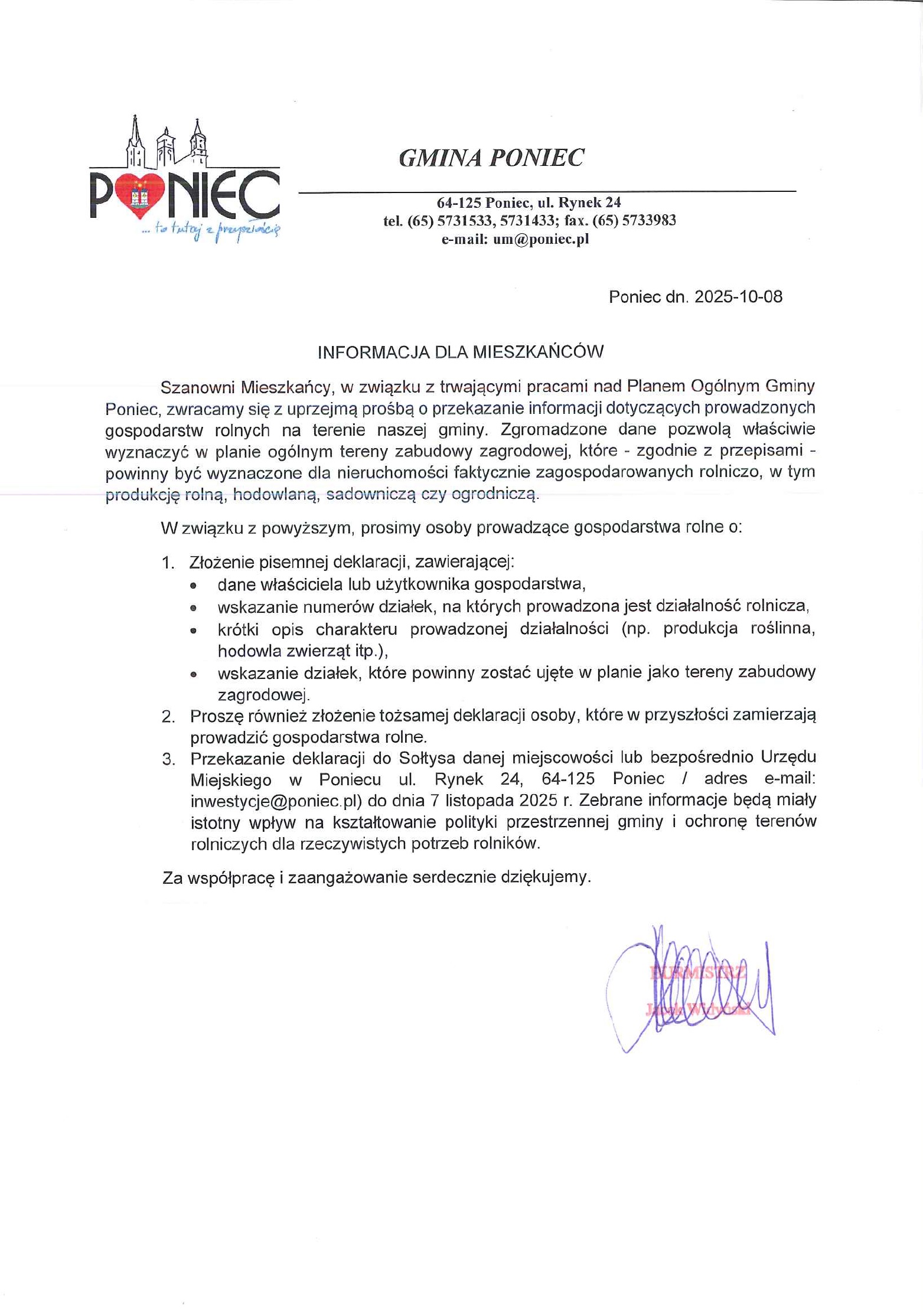 Informacja dla mieszkańców – Plan Ogólny Paweł Maćkowiak2025-10-09T09:32:31+02:009 października, 2025| KALENDARZ WYDARZEŃ DLA MIESZKAŃCA PONIEC Poniec to tutaj z przyszłością Aktualności Kalendarz wydarzeń Zagospodarowanie przestrzenne Strategia rozwoju Bezpłatna pomoc prawna Strefa płatnego parkowania Środki zewnętrzne O GMINIE Historia Honorowi obywatele Kultura Sport Wieści z gminy Poniec Media SAMORZĄD Burmistrz Rada Miejska w Poniecu Komisje Sołtysi Jak załatwić sprawę DLA TURYSTY ZWIEDZANIE Zabytki Gmina Poniec w obiektywie SZLAKI Szlaki rowerowe REKREACJA Stawy Dzięczyńskie DLA BIZNESU INWESTUJ W PONIECU Poniecka Strefa Inwestycyjna INFORMATOR URZĘDY/INSTYTUCJE Urząd Miejski w Poniecu Gminne Centrum Kultury w Poniecu Ośrodek Pomocy Społecznej w Poniecu Ośrodek Sportu i Rekreacji w Poniecu Gminny Zakład Wodociągów i Kanalizacji w Poniecu Gminny Zespół Obsługi Szkół w Poniecu E-urząd OŚWIATA Przedszkole Samorządowe w Poniecu Przedszkole Samorządowe w Łęce Wielkiej Szkoła Podstawowa w Poniecu Szkoła Podstawowa w Żytowiecku Szukaj Podobne wpisy Obchody Narodowego Święta Niepodległości w Poniecu 13 listopada, 2025 Rodzinny wyjazd na Jarmark Bożonarodzeniowy do Drezna 12 listopada, 2025 Planowane Wyłączenie prądu! 12 listopada, 2025 Radośnie i patriotycznie – przedszkolaki z Ponieca uczciły Niepodległość 6 listopada, 2025 Nagroda Wielkopolskiego Kuratora Oświaty dla dyrektora szkoły w Żytowiecku 6 listopada, 2025