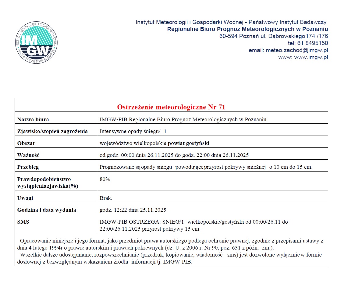 Ostrzeżenie meteorologiczne Paweł Maćkowiak2025-11-25T13:44:47+01:0025 listopada, 2025| KALENDARZ WYDARZEŃ DLA MIESZKAŃCA PONIEC Poniec to tutaj z przyszłością Aktualności Kalendarz wydarzeń Zagospodarowanie przestrzenne Strategia rozwoju Bezpłatna pomoc prawna Strefa płatnego parkowania Środki zewnętrzne O GMINIE Historia Honorowi obywatele Kultura Sport Wieści z gminy Poniec Media SAMORZĄD Burmistrz Rada Miejska w Poniecu Komisje Sołtysi Jak załatwić sprawę DLA TURYSTY ZWIEDZANIE Zabytki Gmina Poniec w obiektywie SZLAKI Szlaki rowerowe REKREACJA Stawy Dzięczyńskie DLA BIZNESU INWESTUJ W PONIECU Poniecka Strefa Inwestycyjna INFORMATOR URZĘDY/INSTYTUCJE Urząd Miejski w Poniecu Gminne Centrum Kultury w Poniecu Ośrodek Pomocy Społecznej w Poniecu Ośrodek Sportu i Rekreacji w Poniecu Gminny Zakład Wodociągów i Kanalizacji w Poniecu Gminny Zespół Obsługi Szkół w Poniecu E-urząd OŚWIATA Przedszkole Samorządowe w Poniecu Przedszkole Samorządowe w Łęce Wielkiej Szkoła Podstawowa w Poniecu Szkoła Podstawowa w Żytowiecku Szukaj Podobne wpisy Badania ankietowe dot. pogłowia świń, produkcji żywca wieprzowego oraz drobiu 4 grudnia, 2025 Otwarty konkurs ofert na realizację w 2026 r. przez organizacje pozarządowe zadań publicznych powiatu gostyńskiego 3 grudnia, 2025 „Środy z KSeF” w Gostyniu – VIII spotkanie – 10.12.2025 3 grudnia, 2025 Nieruchomości lokalowe na sprzedaż – ostatnie dni na wpłatę wadium 3 grudnia, 2025 Ostrzeżenie meteorologiczne 1 grudnia, 2025