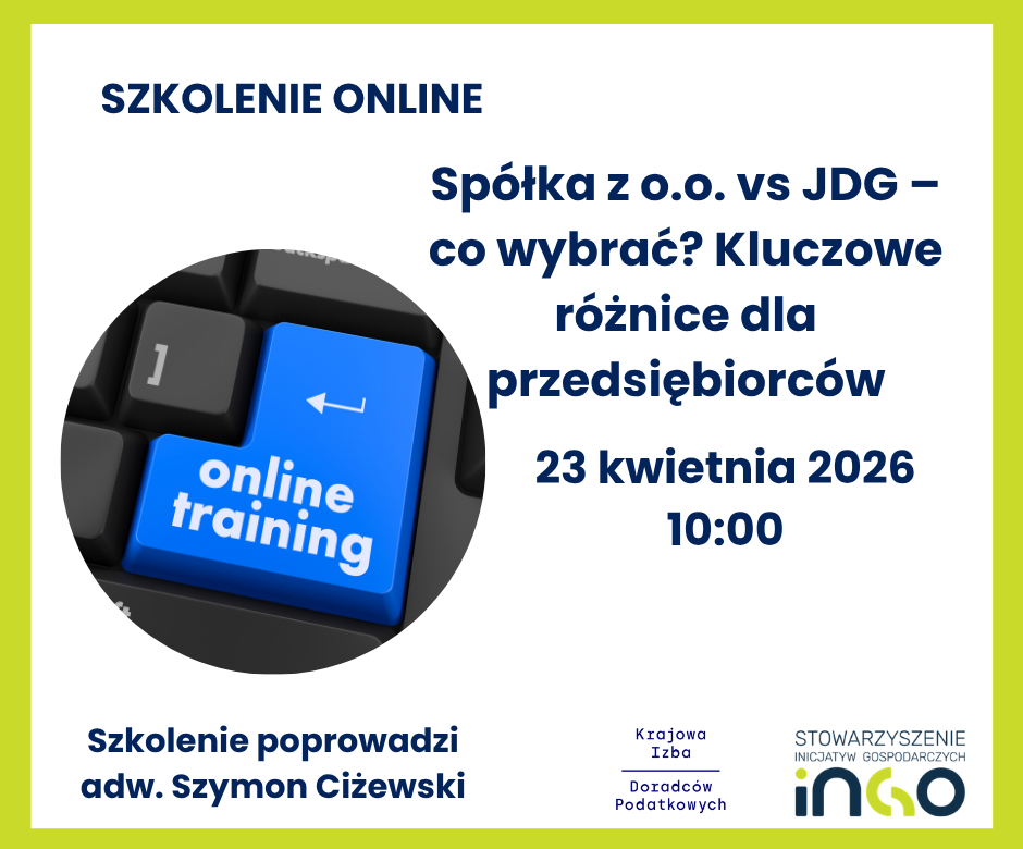 Stowarzyszenie Inicjatyw Gospodarczych inGO we współpracy z Wielkopolskim Oddziałem Krajowej Izby Doradców Podatkowych, zaprasza na bezpłatne szkolenie online, które odbędzie się 23 kwietnia 2026 r. o godz. 10:00.