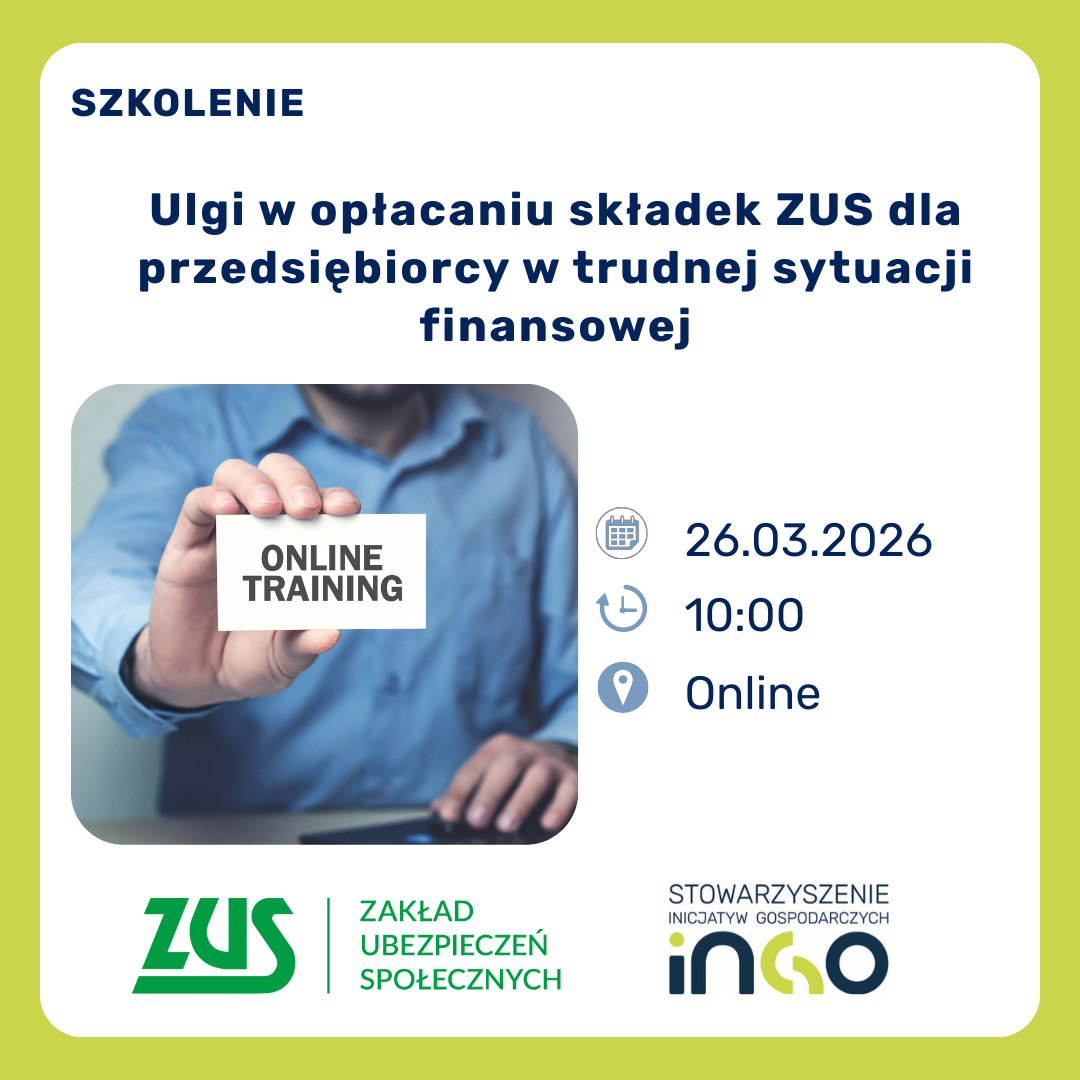 Stowarzyszenie Inicjatyw Gospodarczych inGO we współpracy z Oddziałem Zakładu Ubezpieczeń Społecznych w Ostrowie Wielkopolskim, zaprasza na bezpłatne szkolenie Online, które odbędzie się 26 marca 2026 roku o godzinie 10:00.
