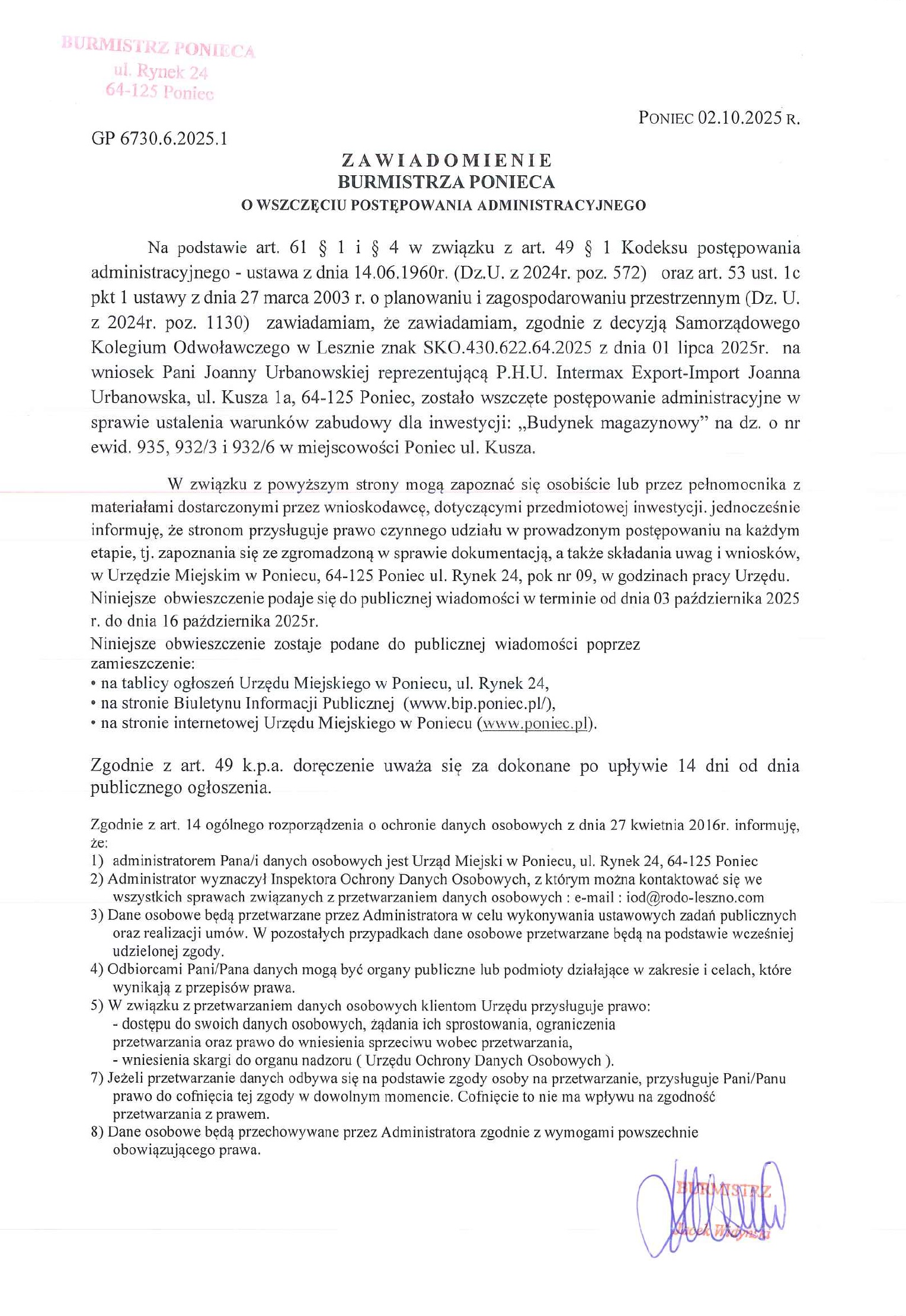 Zawiadomienie Burmistrza Ponieca o wszczęciu postępowania dot. wydania decyzji o warunkach zabudowy dot. Budynku magazynowego na dz. nr 935 w Poniecu Paweł Maćkowiak2025-10-03T08:20:48+02:003 października, 2025| KALENDARZ WYDARZEŃ DLA MIESZKAŃCA PONIEC Poniec to tutaj z przyszłością Aktualności Kalendarz wydarzeń Zagospodarowanie przestrzenne Strategia rozwoju Bezpłatna pomoc prawna Strefa płatnego parkowania Środki zewnętrzne O GMINIE Historia Honorowi obywatele Kultura Sport Wieści z gminy Poniec Media SAMORZĄD Burmistrz Rada Miejska w Poniecu Komisje Sołtysi Jak załatwić sprawę DLA TURYSTY ZWIEDZANIE Zabytki Gmina Poniec w obiektywie SZLAKI Szlaki rowerowe REKREACJA Stawy Dzięczyńskie DLA BIZNESU INWESTUJ W PONIECU Poniecka Strefa Inwestycyjna INFORMATOR URZĘDY/INSTYTUCJE Urząd Miejski w Poniecu Gminne Centrum Kultury w Poniecu Ośrodek Pomocy Społecznej w Poniecu Ośrodek Sportu i Rekreacji w Poniecu Gminny Zakład Wodociągów i Kanalizacji w Poniecu Gminny Zespół Obsługi Szkół w Poniecu E-urząd OŚWIATA Przedszkole Samorządowe w Poniecu Przedszkole Samorządowe w Łęce Wielkiej Szkoła Podstawowa w Poniecu Szkoła Podstawowa w Żytowiecku Szukaj Podobne wpisy Badania ankietowe dot. pogłowia świń, produkcji żywca wieprzowego oraz drobiu 4 grudnia, 2025 Otwarty konkurs ofert na realizację w 2026 r. przez organizacje pozarządowe zadań publicznych powiatu gostyńskiego 3 grudnia, 2025 „Środy z KSeF” w Gostyniu – VIII spotkanie – 10.12.2025 3 grudnia, 2025 Nieruchomości lokalowe na sprzedaż – ostatnie dni na wpłatę wadium 3 grudnia, 2025 Ostrzeżenie meteorologiczne 1 grudnia, 2025